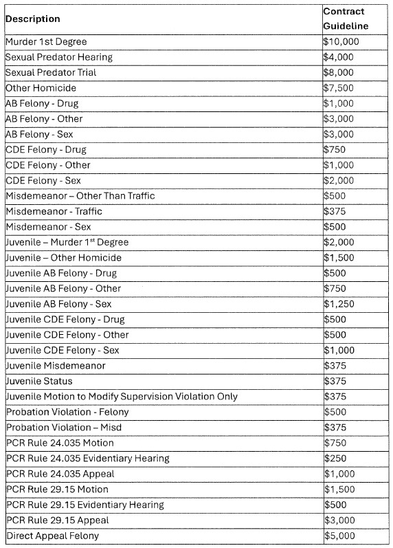 Panel attorneys are paid an initial retainer fee for each case assignment in accordance with the contract fee schedule below. When multiple cases are assigned for the same client, the full contract guideline amount is paid for the most serious case and the multi-case discounted rate of half the contract guideline amount is paid for other cases. The multi-case rate applies to other cases for that client even if the case is in another county.